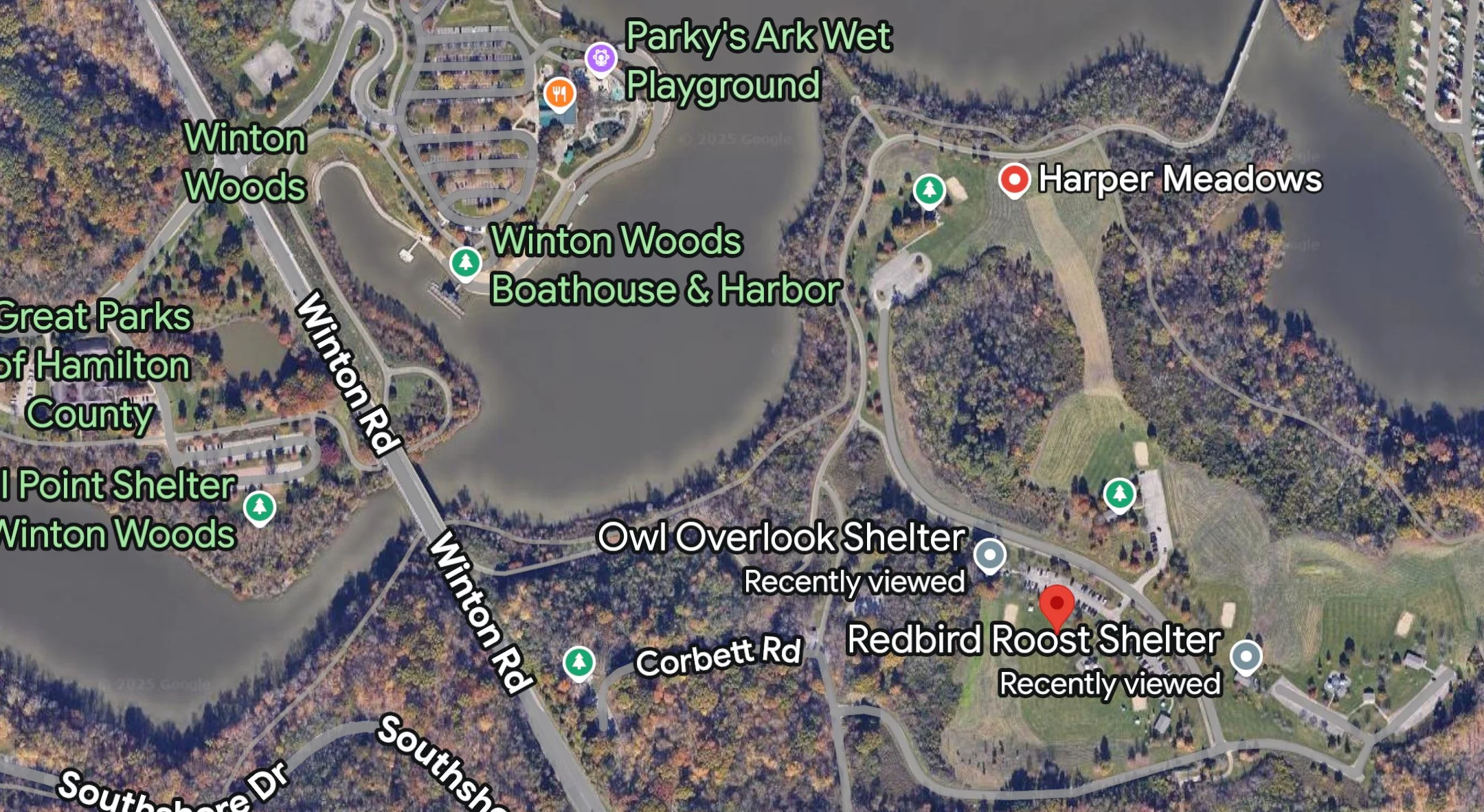 Meeting at the waypoint just next to Owl Overlook Shelter (found in Harper Meadows just south of Winton Woods Harbor)